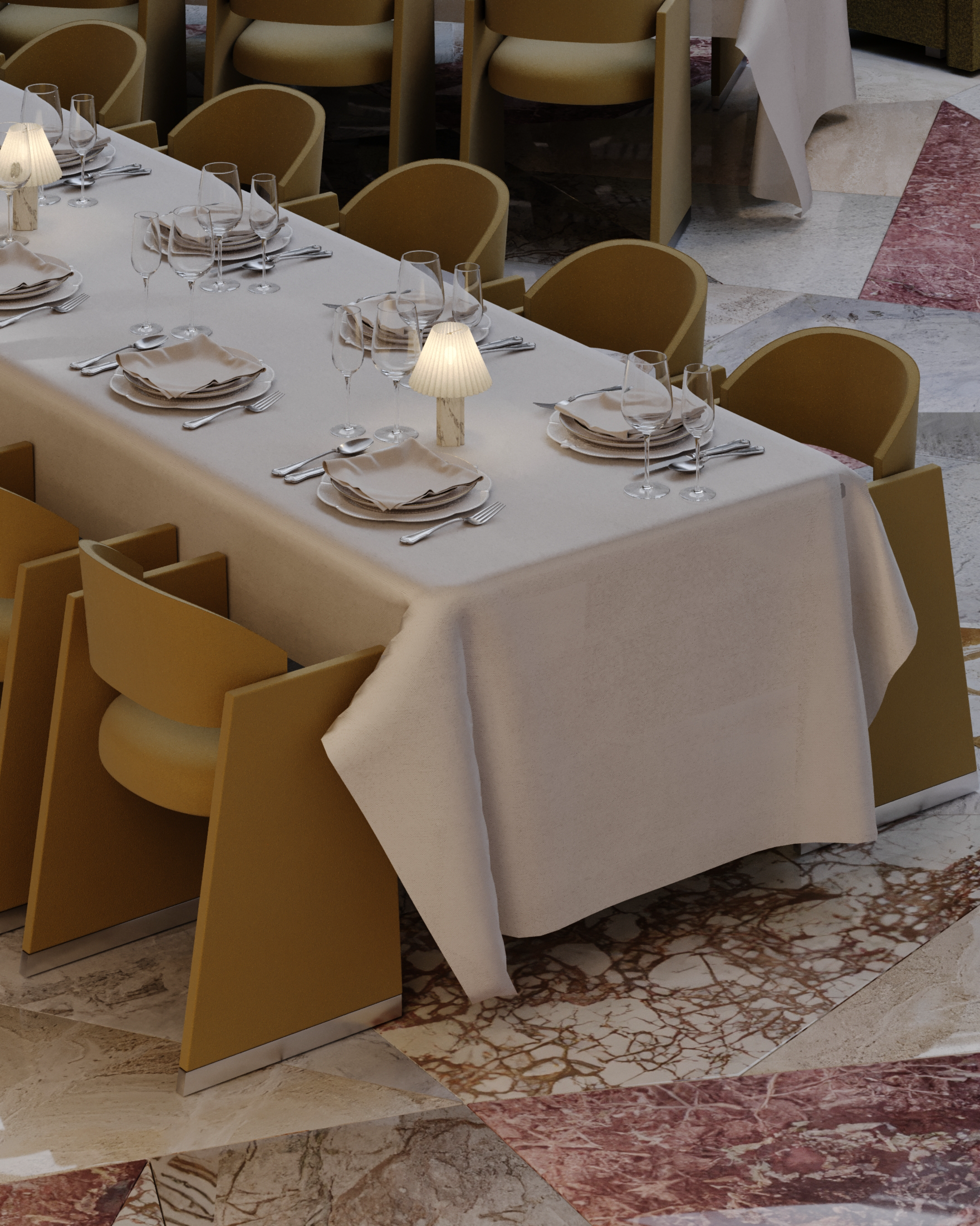 The design unfolds through layered atmospheres: a refined restaurant, a sculptural café, an art gallery, and a florist atelier—each connected through a shared sensibility of craft and curation.